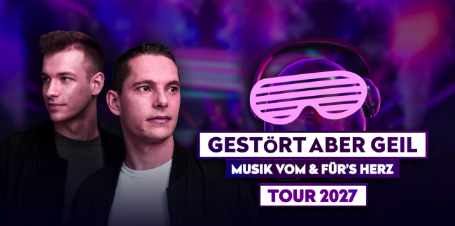 2027 wird ein Jahr voller Emotionen, Energie und unvergesslicher Momente: Gestört aber GeiL gehen mit ihrer brandneuen Liveshow auf große Deutschlandtour und präsentieren mit „Musik vom & für’s Herz“ ein musikalisches Erlebnis, das tiefer geht als je zuvor. Das DJ-Duo, bekannt für seine einzigartige Mischung aus elektronischen Klängen und emotionalen Melodien, bringt eine Show auf die Bühnen des Landes, die die Fans von Anfang bis Ende mitreißen wird.